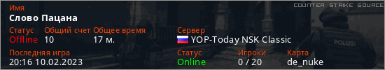 Играет на Counter Strike Source сервере. Страна: РоссияПервый раз замечен 20:02 10.02.2023