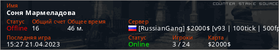 Играет на Counter Strike Source сервере. Страна: РоссияПервый раз замечен 21:59 30.03.2023
