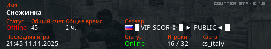 Играет на Counter Strike 1.6 сервере. Страна: РоссияПервый раз замечен 10:02 26.10.2025