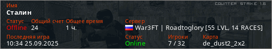 Последний раз был в сети 10:34 25.09.2025 Игрок с таким ником замечен на 41 сервере