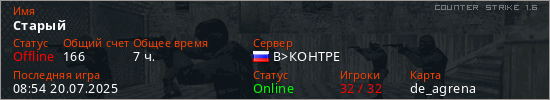 Играет на Counter Strike 1.6 сервере. Страна: РоссияПервый раз замечен 00:28 14.12.2021