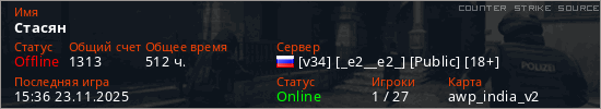 Играет на Counter Strike Source сервере. Страна: РоссияПервый раз замечен 08:47 21.10.2023