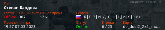 Играет на Counter Strike 1.6 сервере. Страна: РоссияПервый раз замечен 17:39 28.05.2021