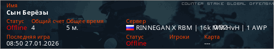 Играет на Counter Strike Global Offensive сервере. Страна: РоссияПервый раз замечен 08:41 27.01.2026