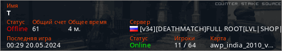 Играет на Counter Strike Source сервере. Страна: РоссияПервый раз замечен 00:23 20.05.2024