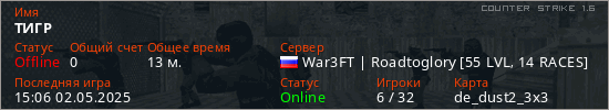 Последний раз был в сети 15:06 02.05.2025 Игрок с таким ником замечен на 21 сервере