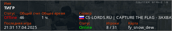 Последний раз был в сети 21:31 17.04.2025 Игрок с таким ником замечен на 21 сервере