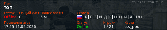 Играет на Counter Strike 1.6 сервере. Страна: РоссияПервый раз замечен 17:20 11.02.2026