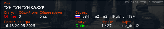 Играет на Counter Strike Source сервере. Страна: РоссияПервый раз замечен 16:43 20.05.2025