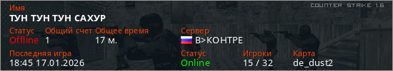 Играет на Counter Strike 1.6 сервере. Страна: РоссияПервый раз замечен 19:06 16.01.2026