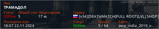 Играет на Counter Strike Source сервере. Страна: РоссияПервый раз замечен 16:31 17.11.2024