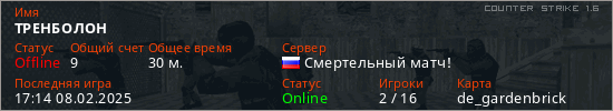 Последний раз был в сети 17:14 08.02.2025 Игрок с таким ником замечен на 9 серверах