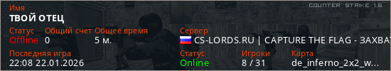 Играет на Counter Strike 1.6 сервере. Страна: РоссияПервый раз замечен 22:06 22.01.2026