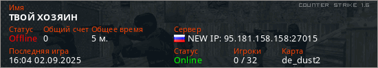 Играет на Counter Strike 1.6 сервере. Страна: РоссияПервый раз замечен 15:57 02.09.2025