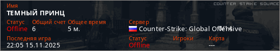 Играет на Counter Strike Source сервере. Страна: РоссияПервый раз замечен 22:01 15.11.2025