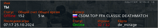 Играет на Counter Strike 1.6 сервере. Страна: РоссияПервый раз замечен 07:13 25.10.2024