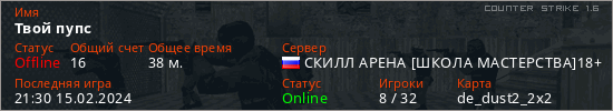 Играет на Counter Strike 1.6 сервере. Страна: РоссияПервый раз замечен 00:52 15.01.2024