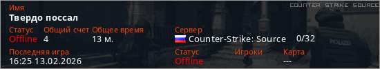 Играет на Counter Strike Source сервере. Страна: РоссияПервый раз замечен 16:06 13.02.2026