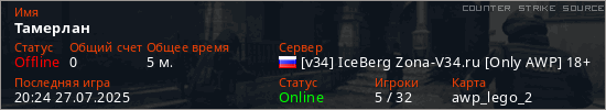Играет на Counter Strike Source сервере. Страна: РоссияПервый раз замечен 20:18 27.07.2025