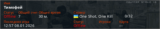Играет на Counter Strike 1.6 сервере. Страна: УкраинаПервый раз замечен 05:02 06.01.2026