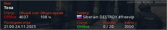Играет на Counter Strike Source сервере. Страна: РоссияПервый раз замечен 16:57 28.01.2023
