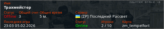 Играет на Counter Strike 1.6 сервере. Страна: УкраинаПервый раз замечен 22:44 05.02.2026