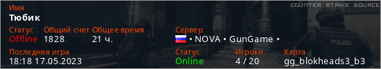 Играет на Counter Strike Source сервере. Страна: РоссияПервый раз замечен 10:33 14.03.2023