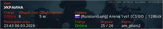 Играет на Counter Strike Global Offensive сервере. Страна: РоссияПервый раз замечен 22:50 06.03.2026