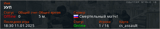 Играет на Counter Strike 1.6 сервере. Страна: РоссияПервый раз замечен 18:26 11.01.2025