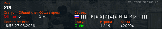 Играет на Counter Strike 1.6 сервере. Страна: РоссияПервый раз замечен 18:39 27.03.2026