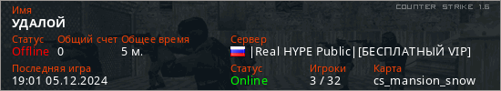 Играет на Counter Strike 1.6 сервере. Страна: РоссияПервый раз замечен 18:59 05.12.2024