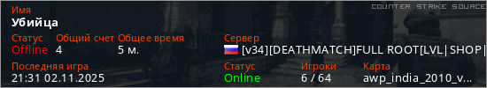 Играет на Counter Strike Source сервере. Страна: РоссияПервый раз замечен 20:54 02.11.2025