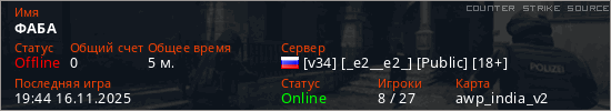 Играет на Counter Strike Source сервере. Страна: РоссияПервый раз замечен 19:42 16.11.2025