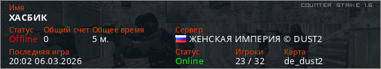 Играет на Counter Strike 1.6 сервере. Страна: РоссияПервый раз замечен 19:54 06.03.2026