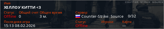 Играет на Counter Strike Source сервере. Страна: РоссияПервый раз замечен 15:13 08.02.2026