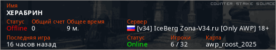 Играет на Counter Strike Source сервере. Страна: РоссияПервый раз замечен 02:38 11.03.2026