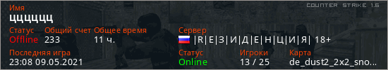 Играет на Counter Strike 1.6 сервере. Страна: РоссияПервый раз замечен 14:49 19.03.2019