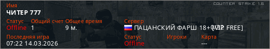 Играет на Counter Strike 1.6 сервере. Страна: РоссияПервый раз замечен 15:33 11.03.2026