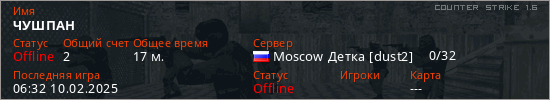 Играет на Counter Strike 1.6 сервере. Страна: РоссияПервый раз замечен 19:17 11.12.2023