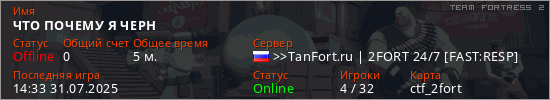 Играет на Team Fortress 2 сервере. Страна: РоссияПервый раз замечен 14:25 31.07.2025