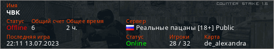 Играет на Counter Strike 1.6 сервере. Страна: РоссияПервый раз замечен 23:51 05.04.2023