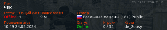 Играет на Counter Strike 1.6 сервере. Страна: РоссияПервый раз замечен 09:59 24.02.2024