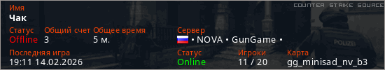 Играет на Counter Strike Source сервере. Страна: РоссияПервый раз замечен 18:39 14.02.2026