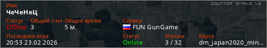 Играет на Counter Strike 1.6 сервере. Страна: РоссияПервый раз замечен 20:47 23.02.2026