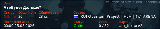 Играет на Counter Strike Global Offensive сервере. Страна: РоссияПервый раз замечен 15:41 22.03.2026