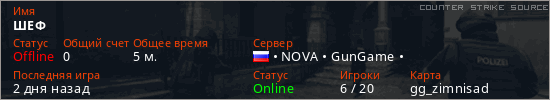 Играет на Counter Strike Source сервере. Страна: РоссияПервый раз замечен 12:33 08.03.2026