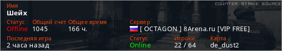 Играет на Counter Strike Source сервере. Страна: РоссияПервый раз замечен 19:04 22.11.2024