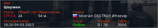 Играет на Counter Strike Source сервере. Страна: РоссияПервый раз замечен 19:48 08.03.2023