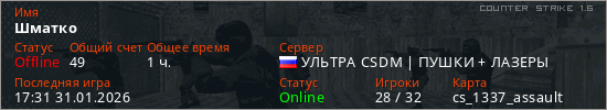 Играет на Counter Strike 1.6 сервере. Страна: РоссияПервый раз замечен 21:17 22.01.2026