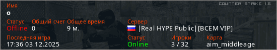 Играет на Counter Strike 1.6 сервере. Страна: РоссияПервый раз замечен 10:26 20.02.2025